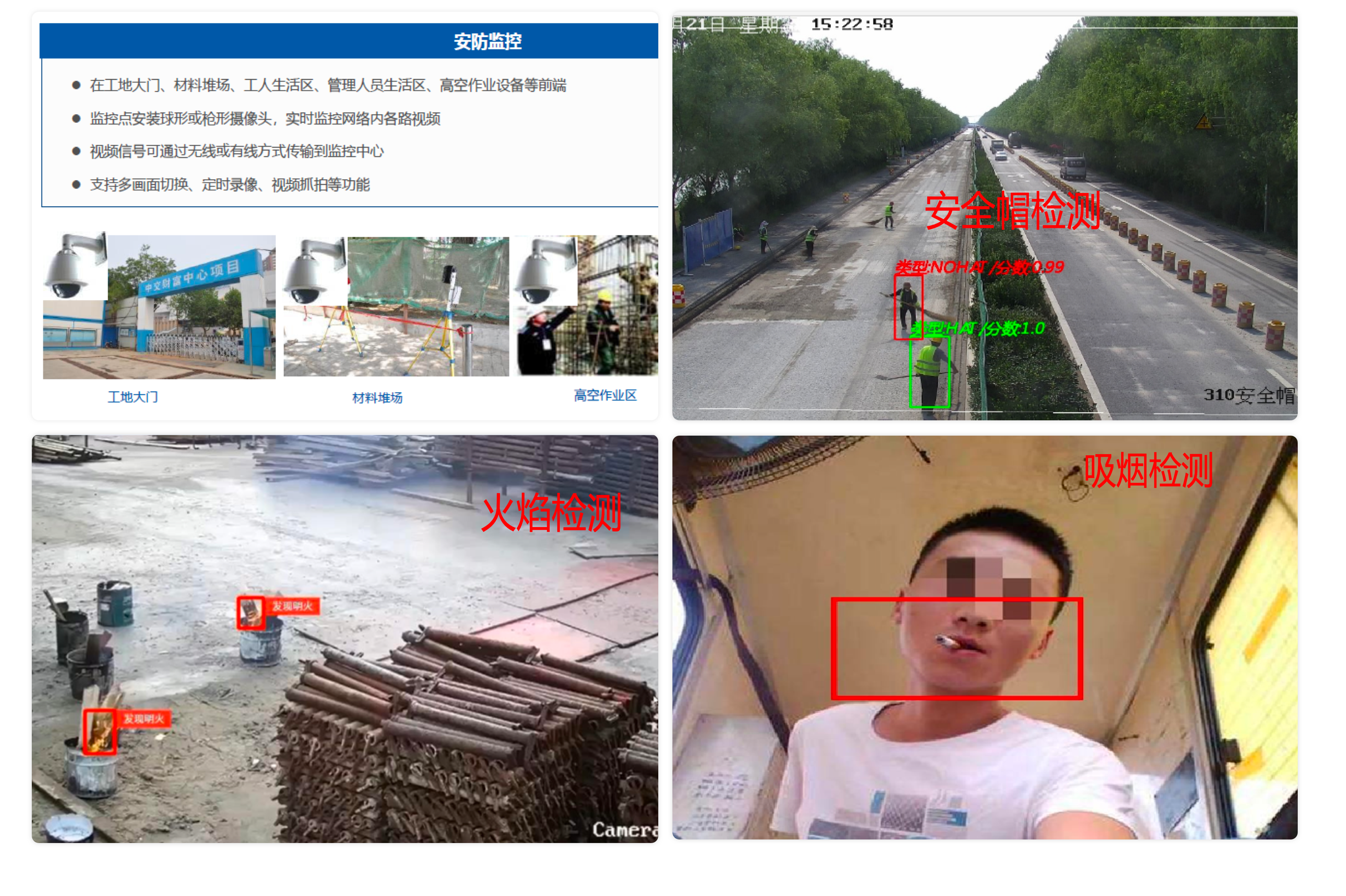 智能視頻監(jiān)控設(shè)備,利用邊緣算法實(shí)時(shí)對(duì)施工現(xiàn)場(chǎng)、人員行為、設(shè)備運(yùn)行狀態(tài)、施工環(huán)境等進(jìn)行監(jiān)控和預(yù)警,及時(shí)發(fā)現(xiàn)安